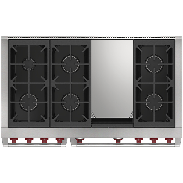 Газовая варочная поверхность состоит из шести горелок, мощностью от 2,7 кВ (для топления) до 5,3 кВ (для быстрого закипания и интенсивной обжарки) . Запатентованная двухуровневая конструкция газовой конфорки Wolf позволяет максимально точно контролировать температуру нагрева. Система искрового реподжига автоматически зажигает горелку при её заливе.